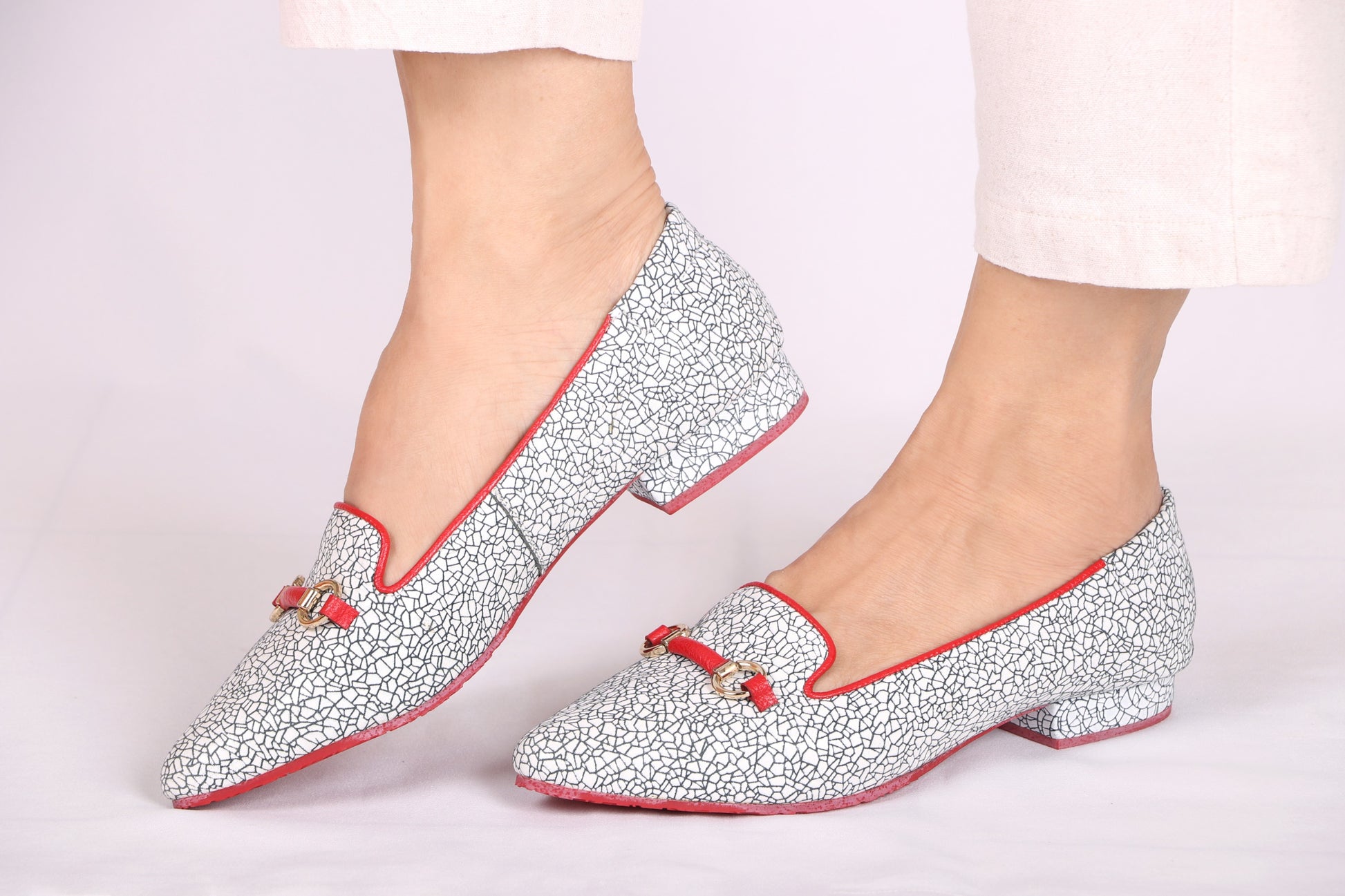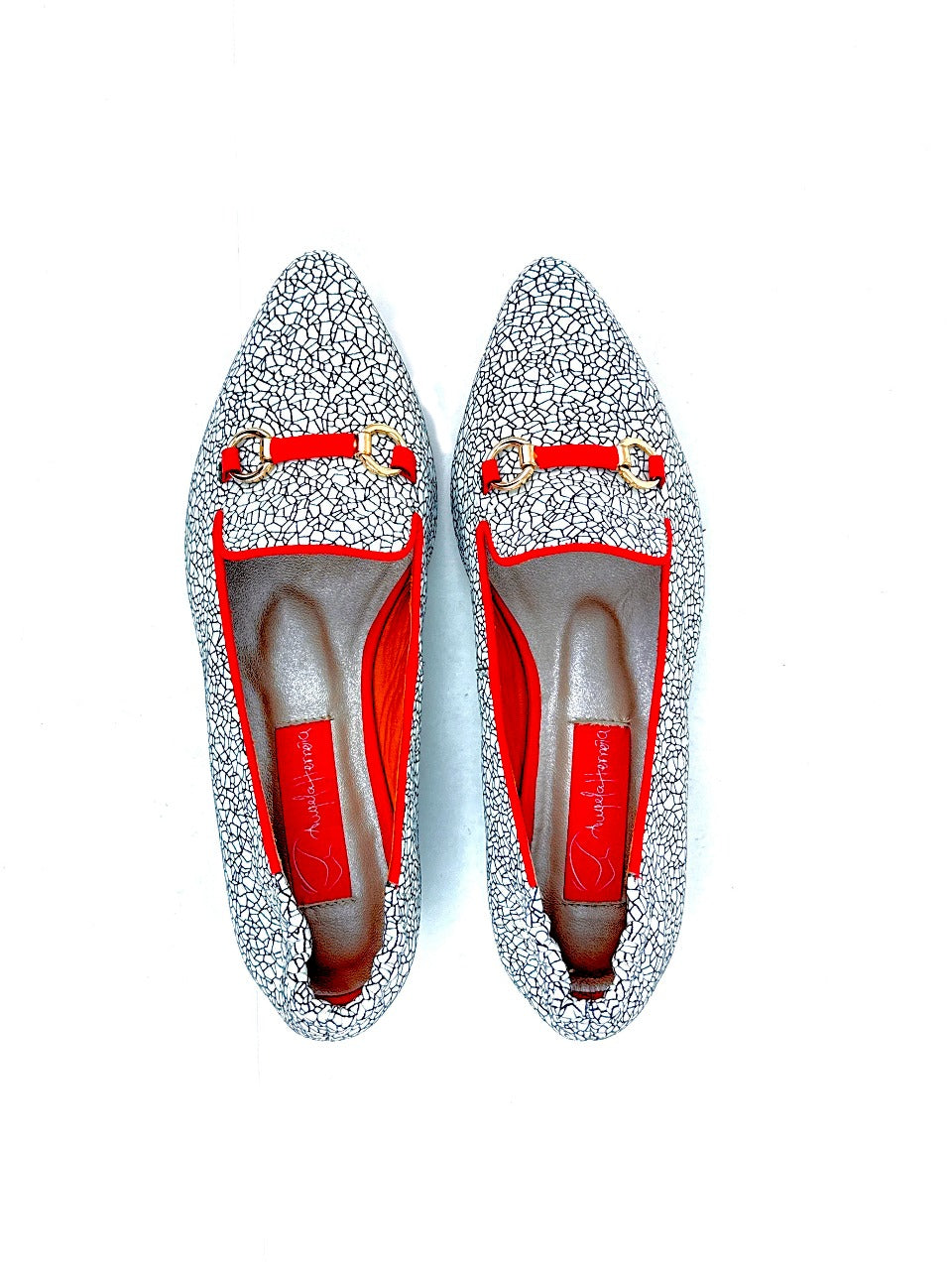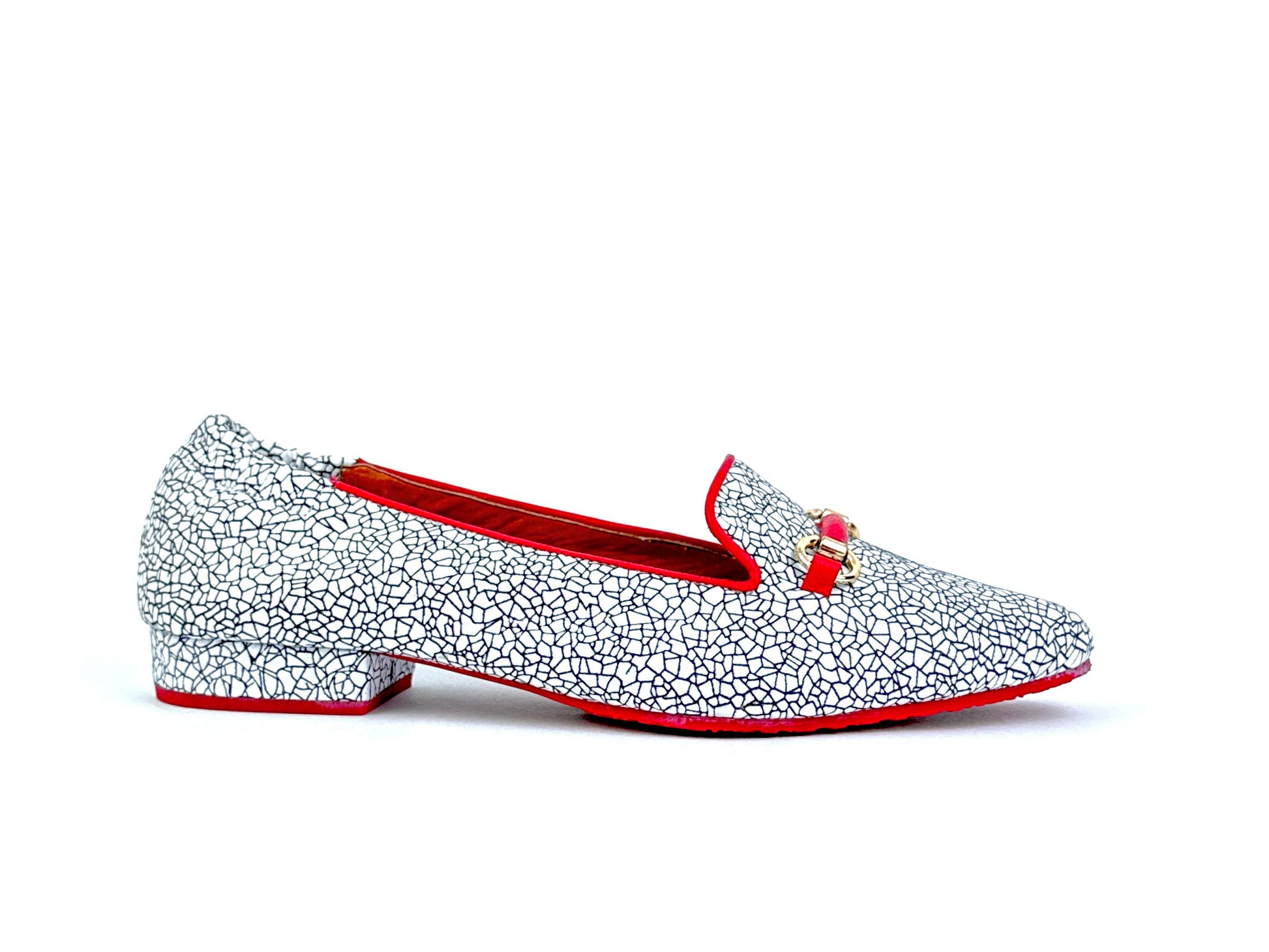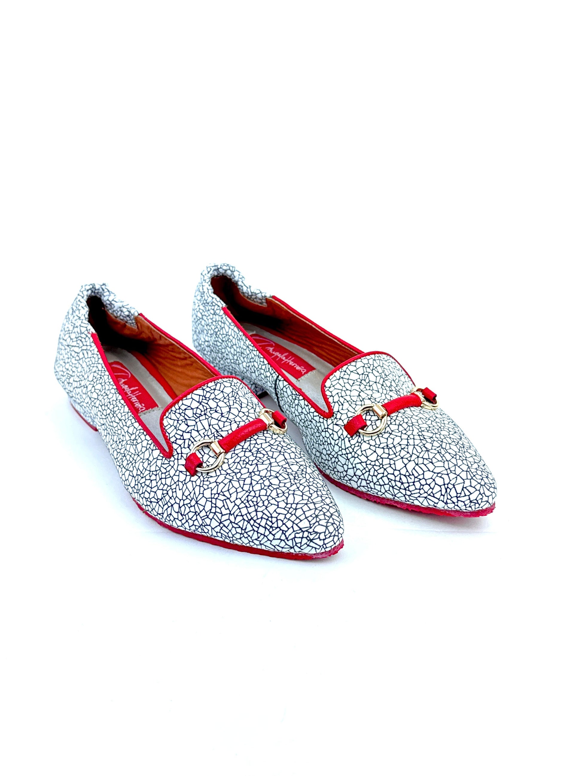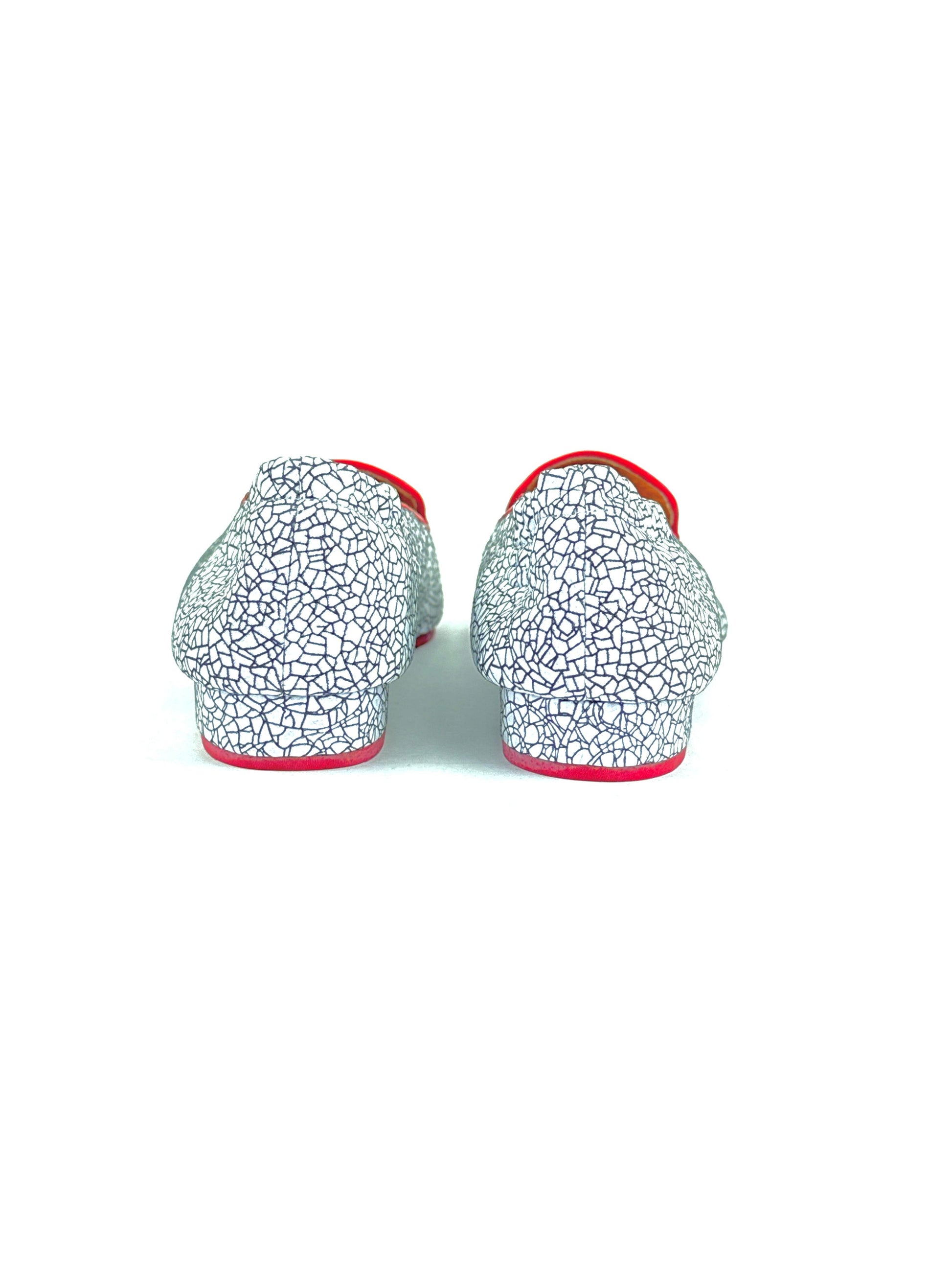 Este modelo de baleta exhibe un diseño elegante y distintivo, con un mosaico craquelado en tonalidades blancas y negras, evocando una textura artística y sofisticada. Los bordes, junto con el interior, están finamente delineados en un vibrante rojo carmesí, que aporta un contraste audaz y lleno de carácter. Ideal para quienes buscan un equilibrio entre comodidad y estilo refinado.